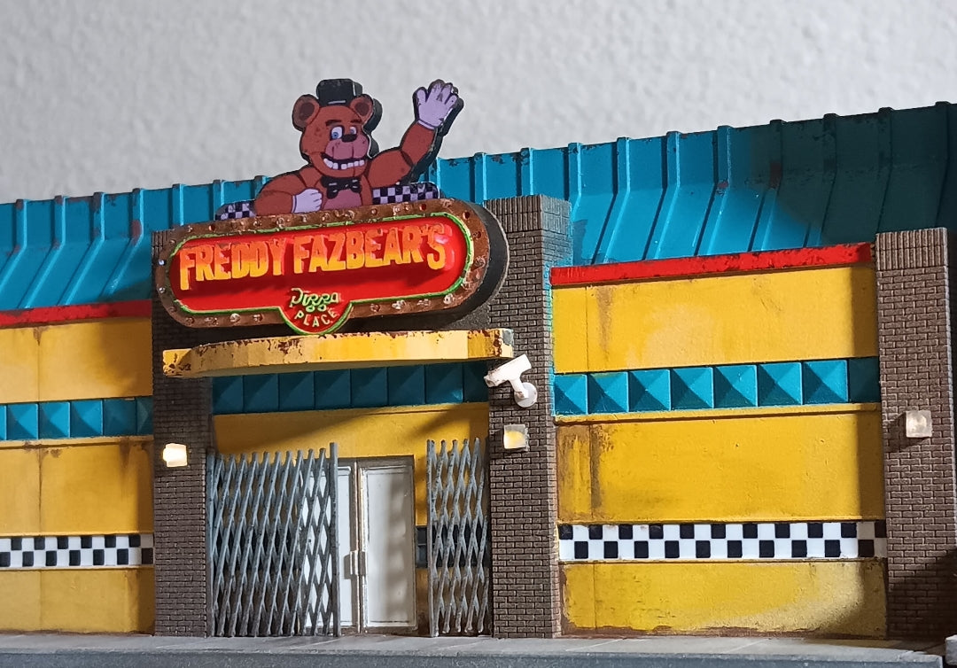 Step into the eerie charm of a cult-classic horror universe with this Freddy’s Pizza Palace Miniature Model, from Five Nights at Freddy's. This hand-crafted fan art collectible inspired by the legendary, neon-soaked restaurant setting. Perfect for horror enthusiasts, diorama builders, collectors, and dedicated fans of nostalgic fright-filled games.